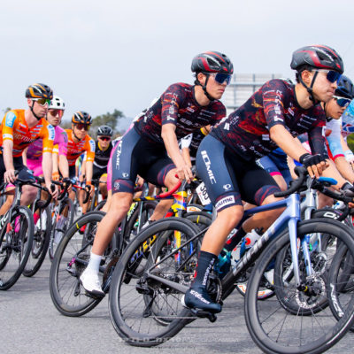 JCTカテゴリーは前日と同じく向川、木村、石原、辻野が出場。やや薄曇りの天候の中、2.9kmのコースを20周する58kmのクリテリウムに挑んだ。