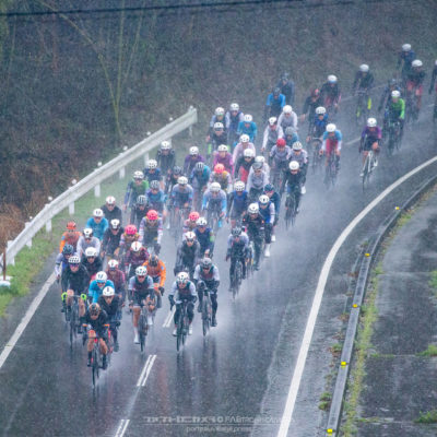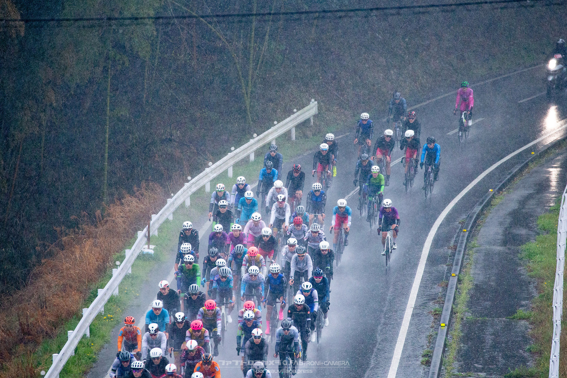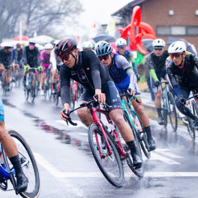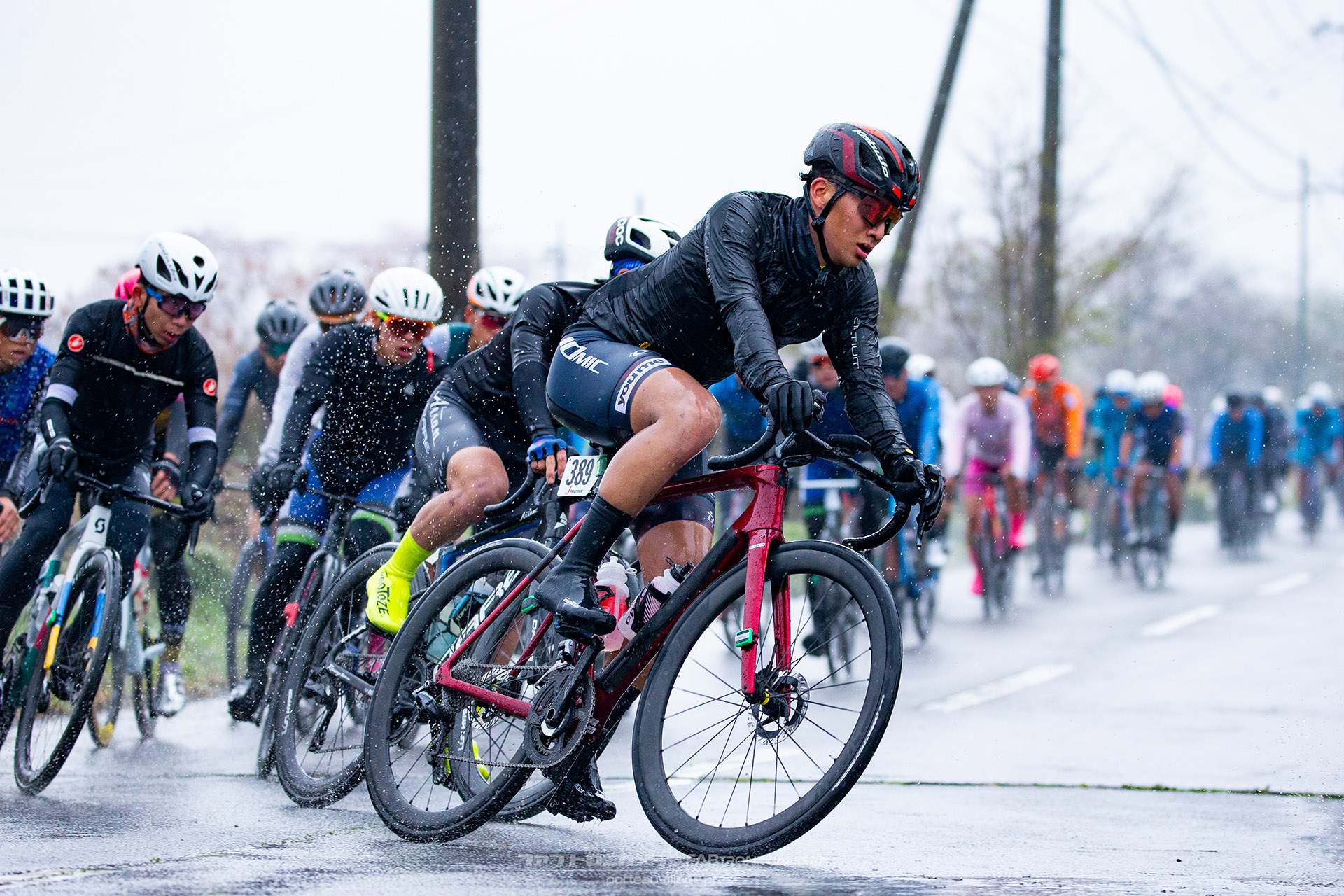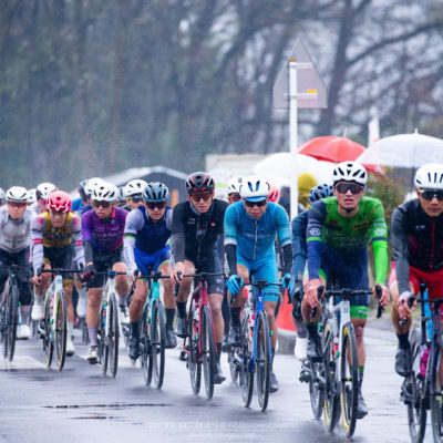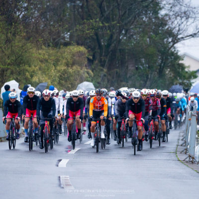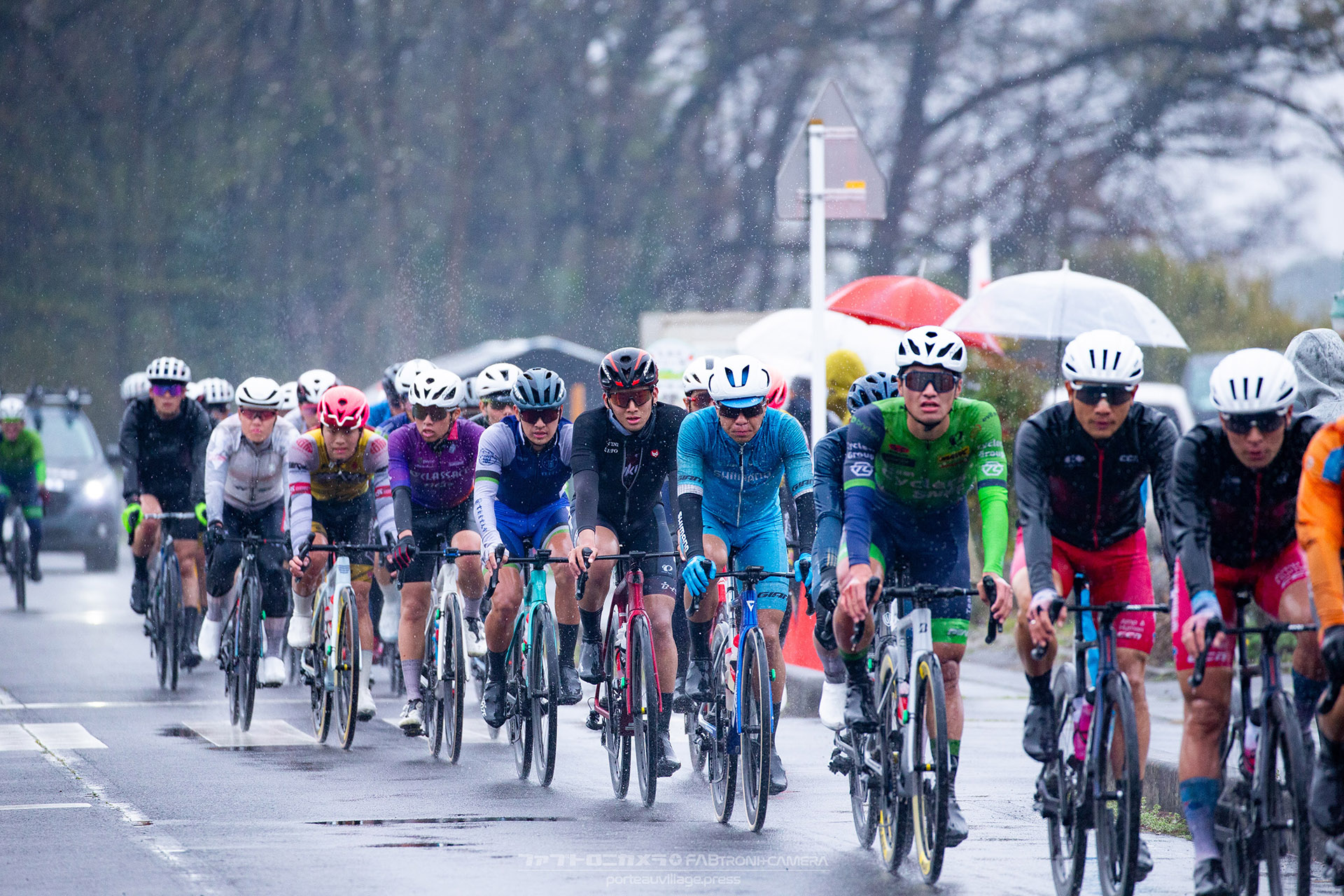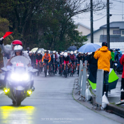 午前中のエリートカテゴリーのレースまでは持ち堪えた天候だったが、JPTレースが始まる午後には土砂降りの雨に。4月ながら、どの選手も防寒ウェアを着込むほどの低い気温の中でレースはスタート。
