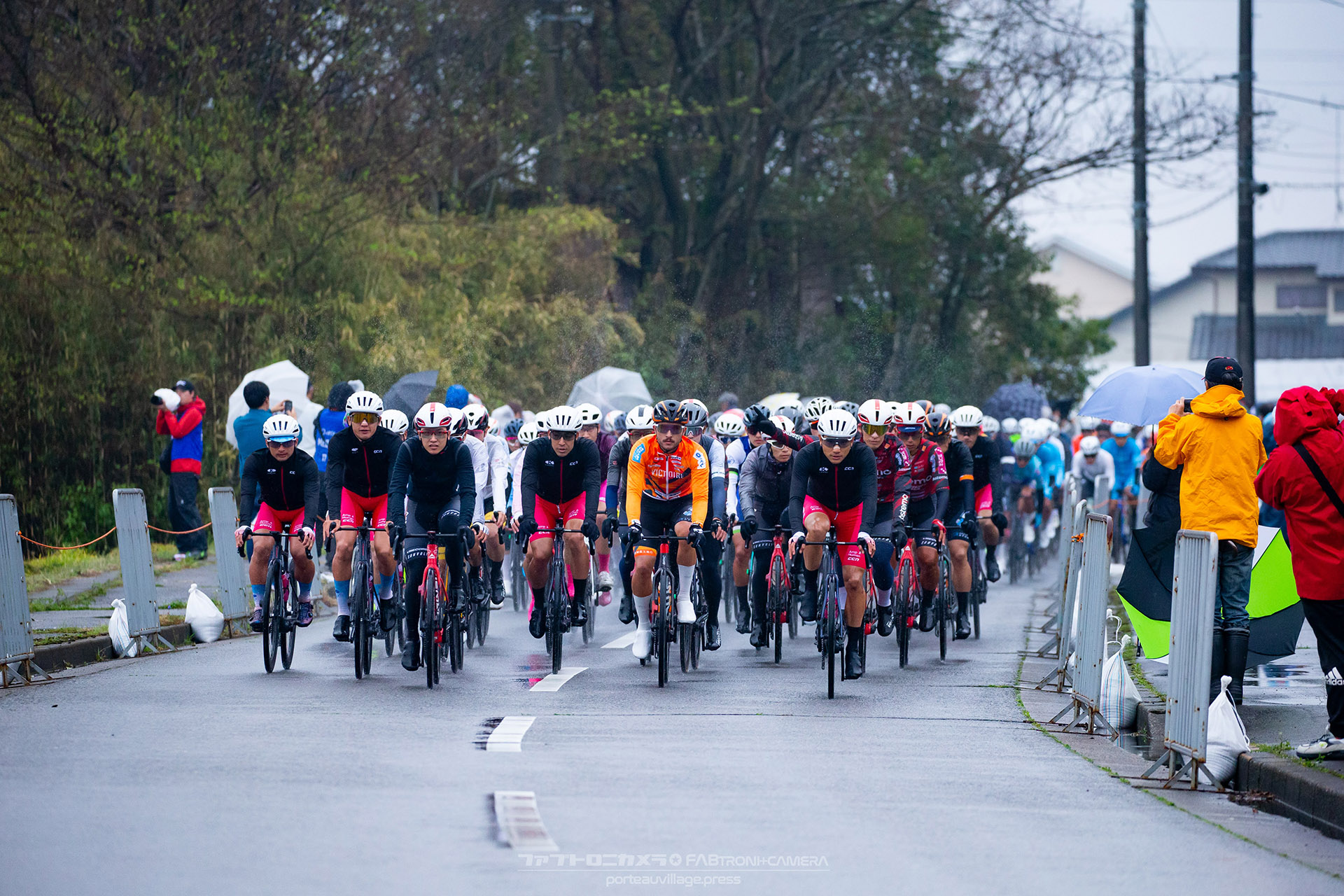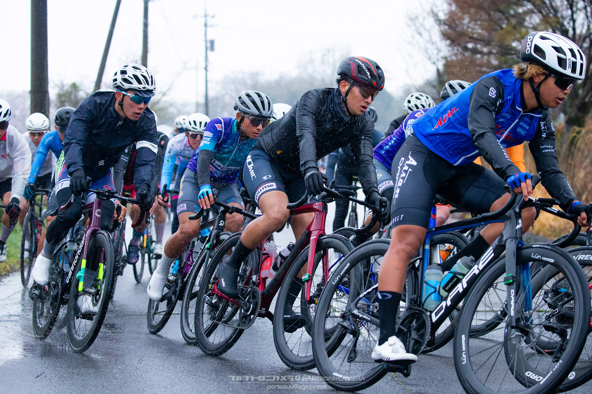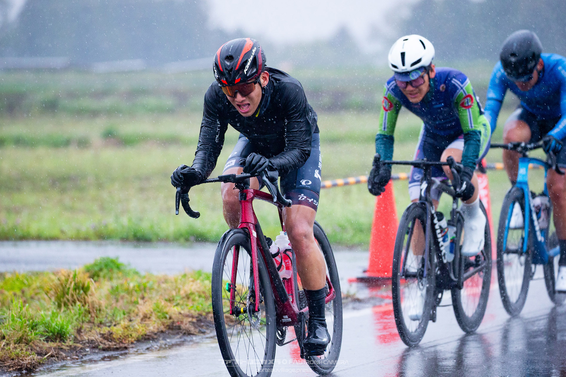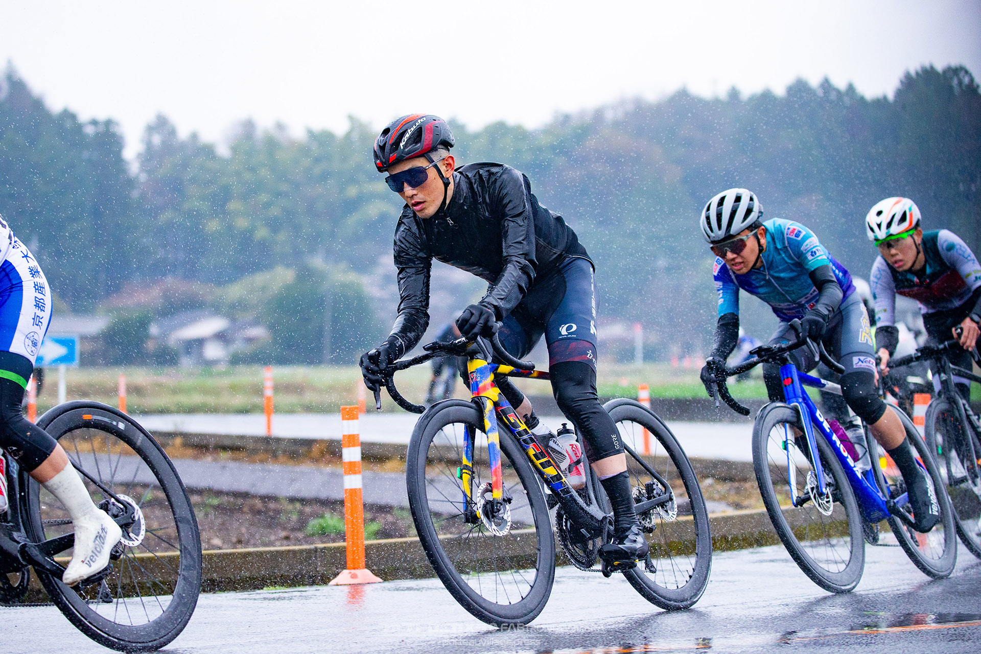 午前中のエリートカテゴリーのレースまでは持ち堪えた天候だったが、JPTレースが始まる午後には土砂降りの雨に。4月ながら、どの選手も防寒ウェアを着込むほどの低い気温の中でレースはスタート。