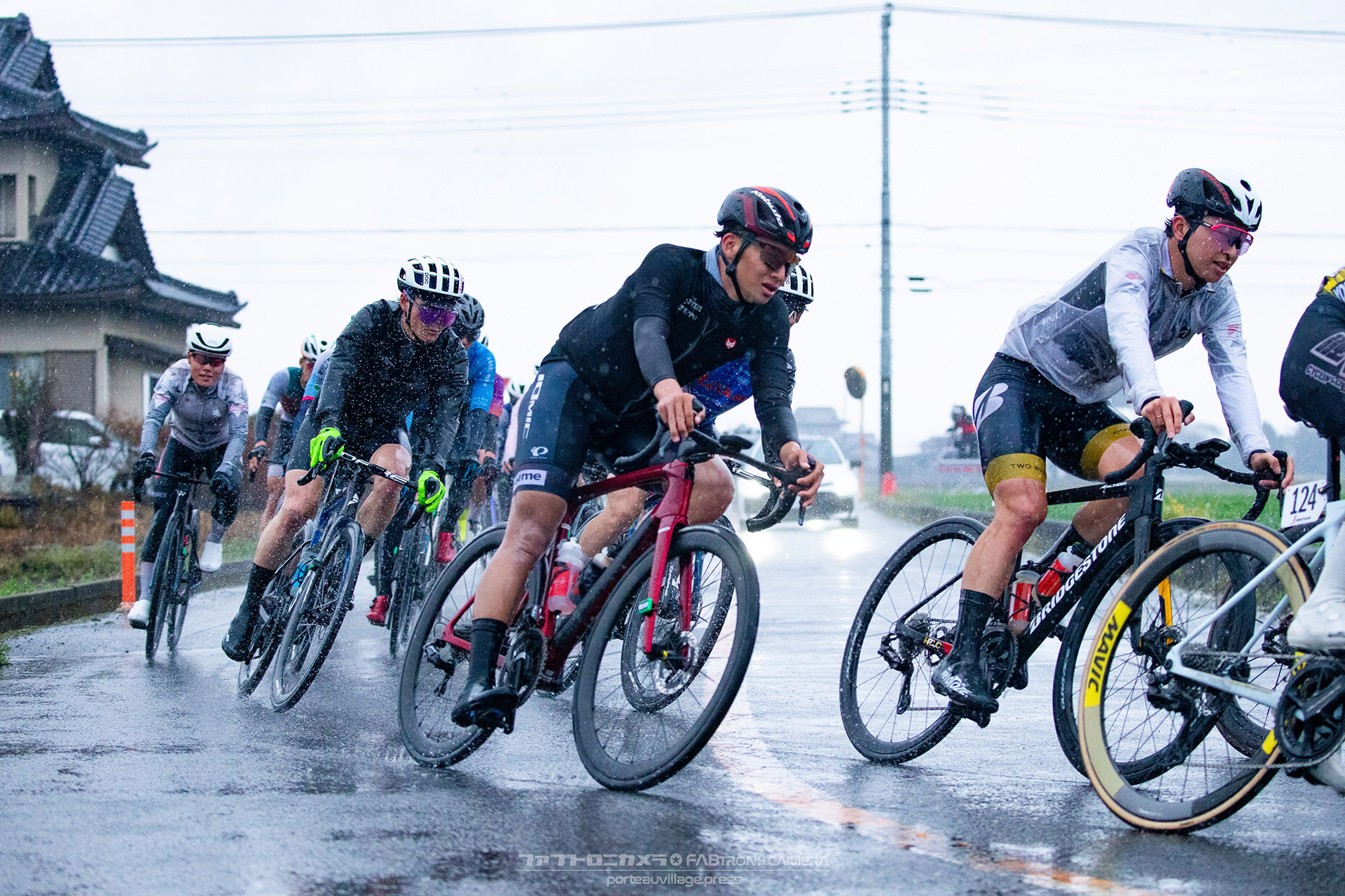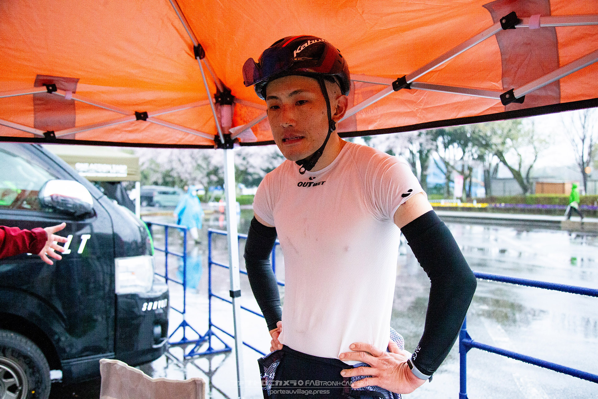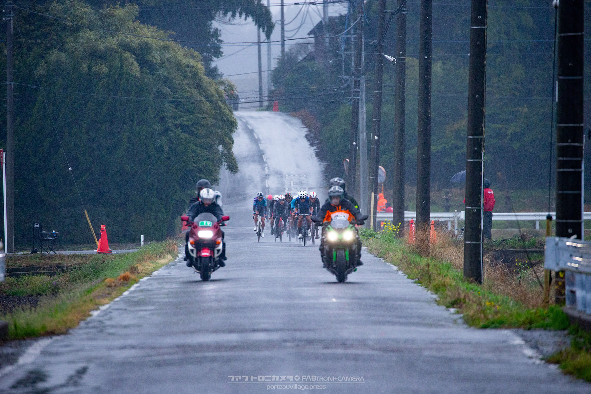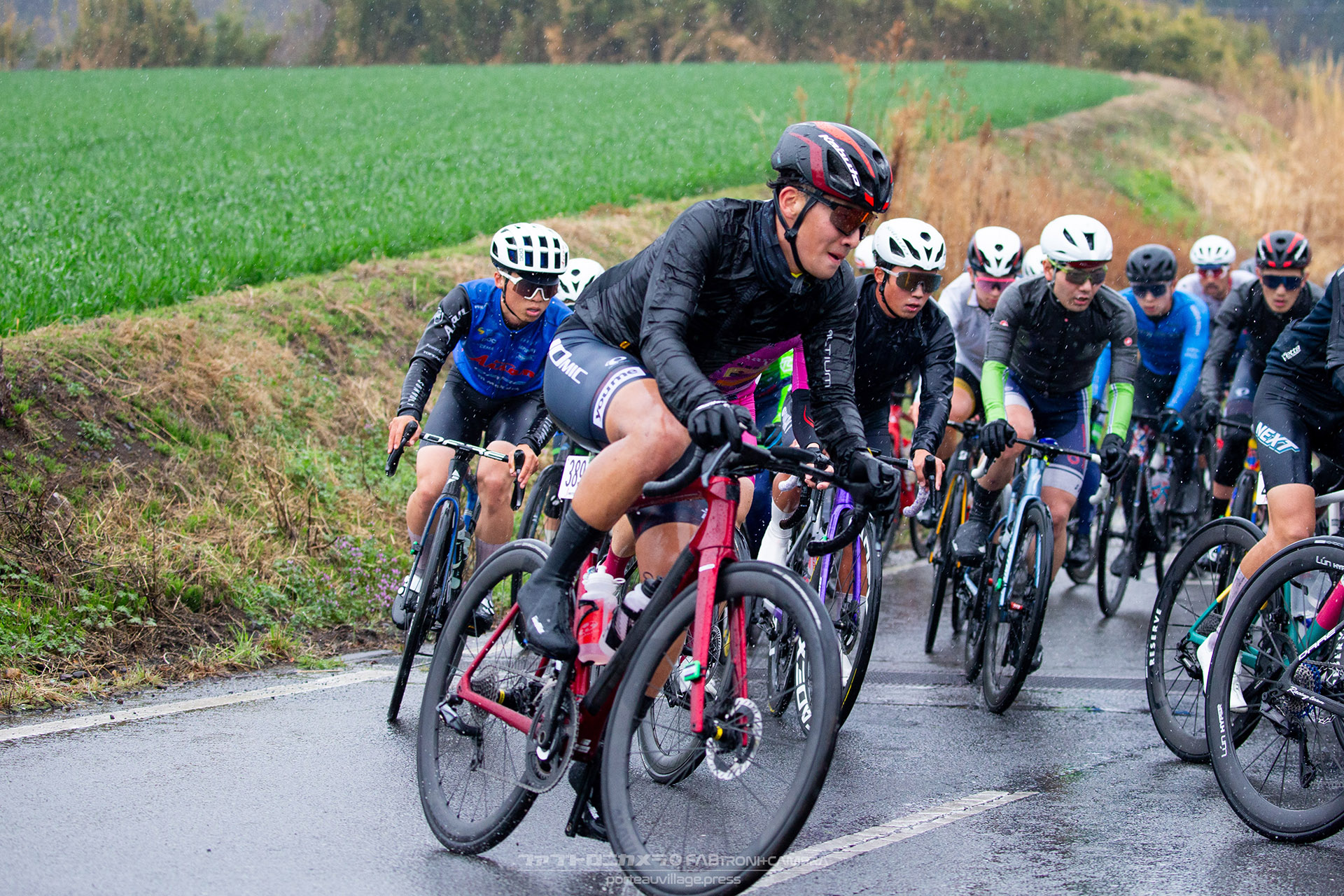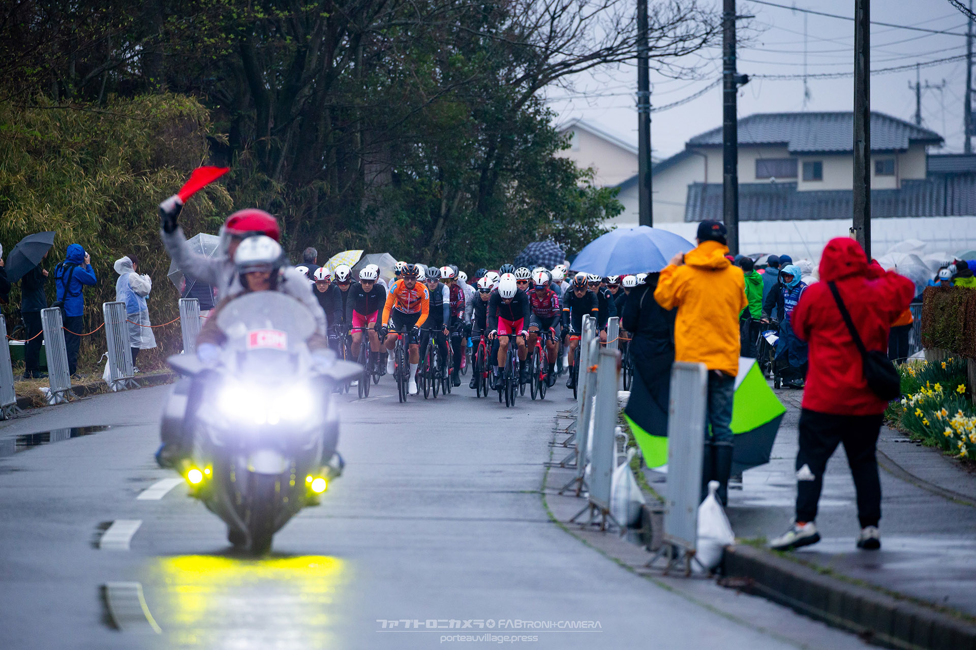 午前中のエリートカテゴリーのレースまでは持ち堪えた天候だったが、JPTレースが始まる午後には土砂降りの雨に。4月ながら、どの選手も防寒ウェアを着込むほどの低い気温の中でレースはスタート。